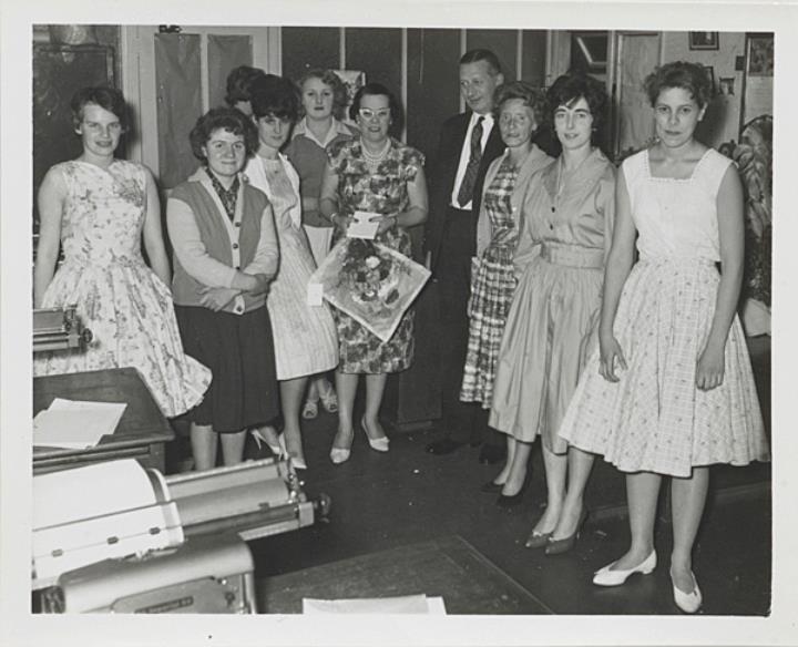 Fotografie, monochrom Büroansicht; Vorgesetzter und Mitarbeiterinnen posieren für ein Gruppenbild, Frau in der Mitte mit Blumenstrauß