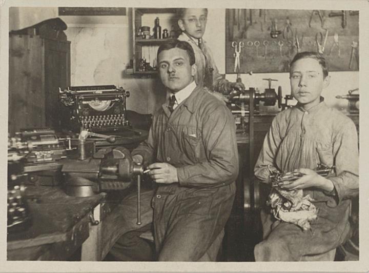 Schreibmaschine, Werkstatt, Instandhaltung, Mann, Kind, Schreibmaschinenmechaniker