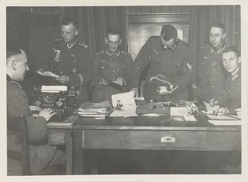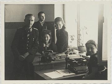 Fotografie, monochrom sechs Männer in Uniform in einer Schreibstube mit Schreibmaschine Stoewer