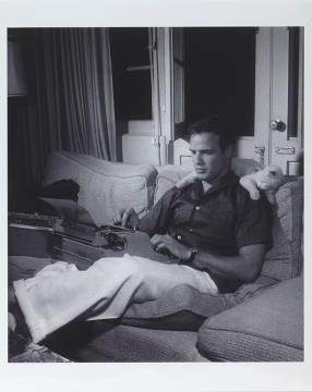 Fotografie, monochrom Schauspieler Marlon Brando mit Schreibmaschine