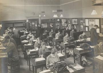 Fotografie, monochrom Büroansicht; in der Mitte Mitarbeiterinnen mit Schreibmaschinen Remington, zu den Seiten männliche und weibliche Mitarbeiter bei der händischen Schreibarbeit Rückseite mit Vermerk