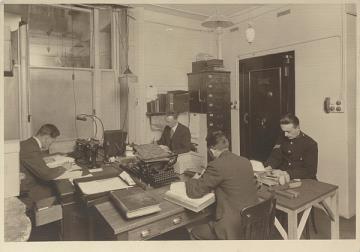 Fotografie, monochrom vier Männer, einer in Uniform, in einem Büro mit Schreibmaschinen und Telefon