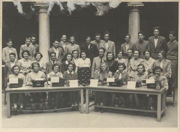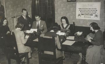 Fotografie, monochrom; Foto: Allegri Brescia Männer und Frauen beim Maschinenschreibunterricht, an der Wand hängend Tastaturschautafel (Everest) Rückseite beschrieben: Dopolavoro Provinciale di Brescia XX