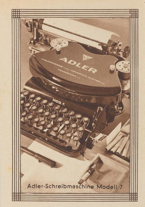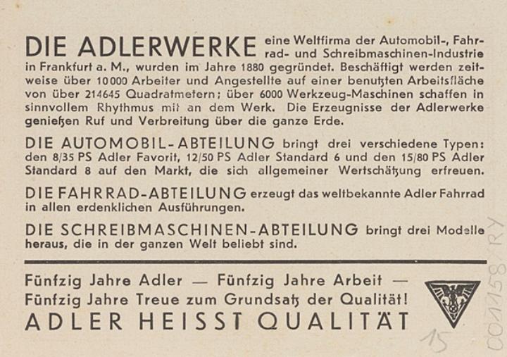 Sammelbild der Adlerwerke (Fünfzig Jahre Adler); monochrom Rückseite mit Werbetext