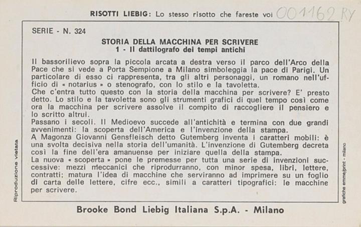 Reklamesammelbild (Liebig); polychrom Serie 324, Bild 1. Il dattilografo dei tempi antichi (Schreiber in der Antike) Rückseite: Erläuterungstext zum Sammelbild, Werbetext zum Produkt