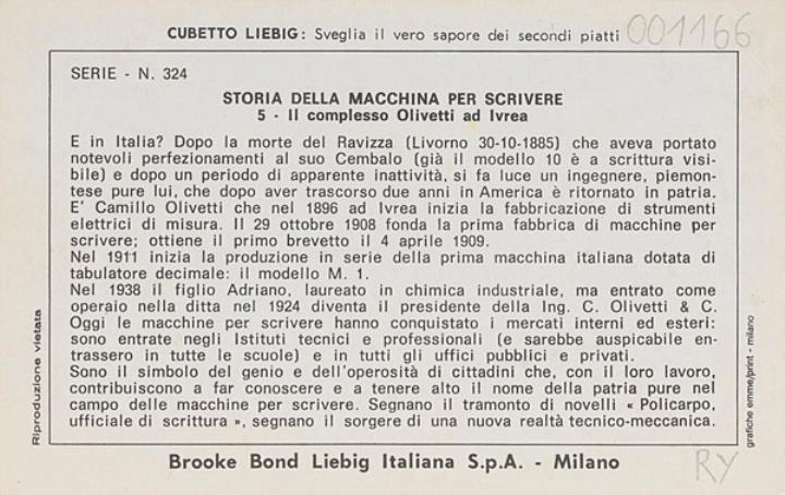 Reklamesammelbild (Liebig); polychrom Serie 324, Bild 5. Il complesso Olivetti ad Ivrea Rückseite: Erläuterungstext zum Sammelbild, Werbetext zum Produkt