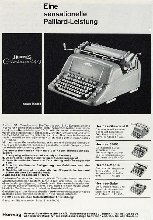 Werbeanzeige für Schreibmaschine Hermes Ambassador monochrom