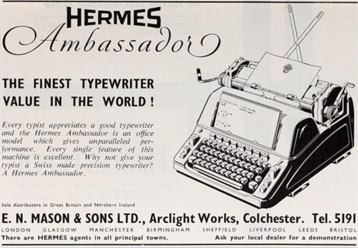 Werbeanzeige für Schreibmaschine Hermes Ambassador monochrom