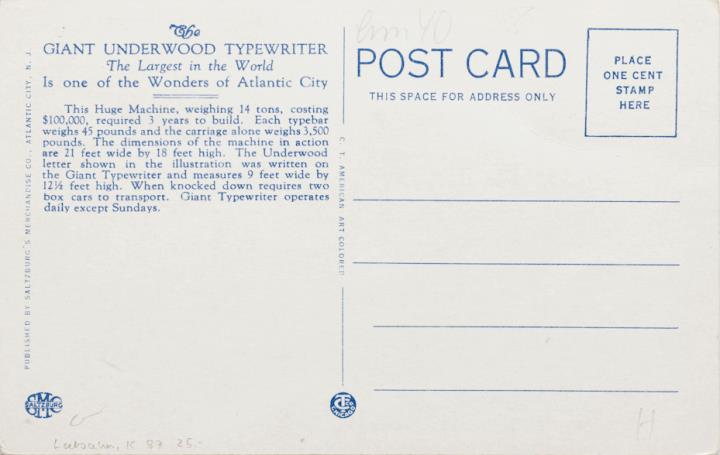 Werbepostkarte; Grafik, polychrom; Nr. OA4935 Rückseite: Schreibmaschine Underwood in Großformat, daneben stehend eine Frau, an der Wand hängend Brief in Großformat; Vorderseite mit Informationstext; nicht beschrieben