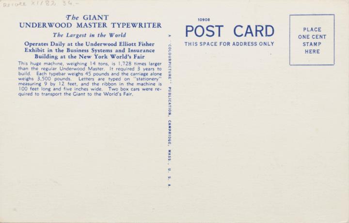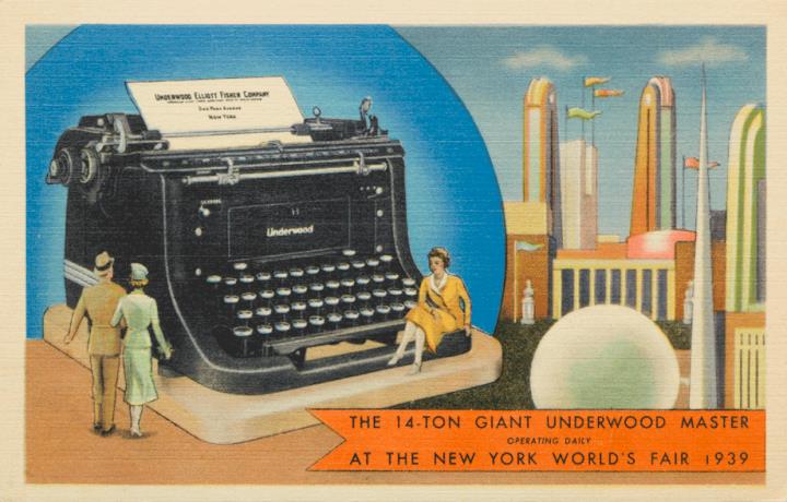 Werbepostkarte; Grafik, polychrom; Rückseite: Schreibmaschine Underwood in Großformat, daneben Personen und Ausstellungsgelände; Vorderseite mit Informationstext; nicht beschrieben