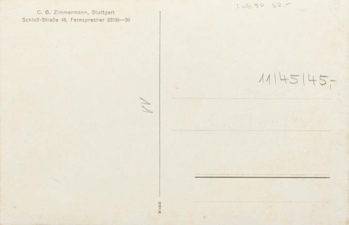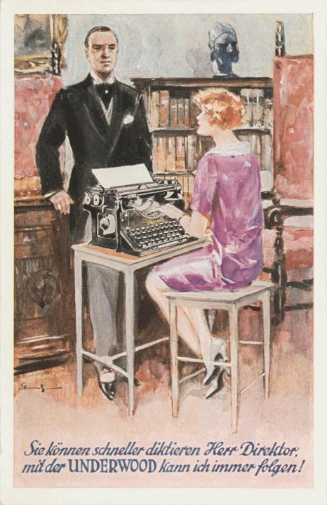 Werbepostkarte; Grafik, polychrom; Rückseite: Vorgesetzter und Sekretärin mit Schreibmaschine Underwood; weiterer Text: [...] mit der Underwood kann ich immer folgen! Vorderseite nicht beschrieben