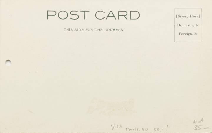 Illustrierte Postkarte mit Kalender; Grafik, polychrom; Rückseite: Frau in Winterkleidung mit kleinem Weihnachtsbaum, darunter Kalender "December 1908"; Vorderseite nicht beschrieben