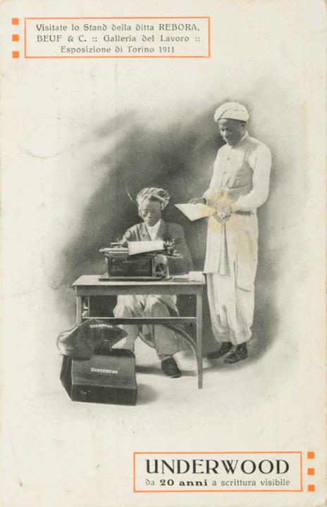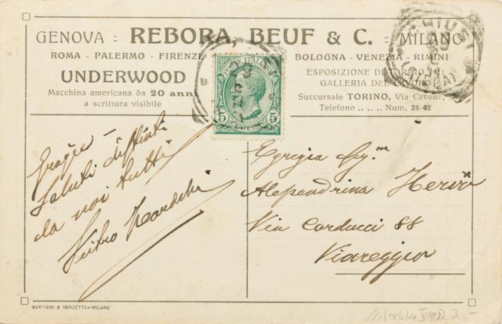 Werbepostkarte; Grafik, polychrom; Rückseite: zwei Männer mit Schreibmaschine Underwood; Vorderseite: Informationstext; adressiert an Sig.na Iberio, Viareggio; Briefmarke Poste Italiane 5 centesimi; Poststempel unleserlich