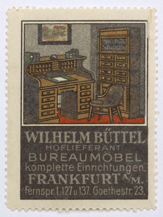 Reklamemarke/Werbemarke für Büromöbelhandlung Wilhelm Büttel; rechteckig, polychrom Text: Hoflieferant Bureaumöbel komplette Einrichtungen, Frankfurt a/M