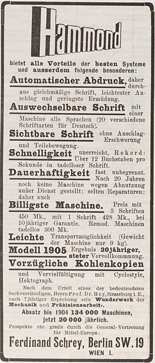 Werbeanzeige für Schreibmaschine Hammond monochrom