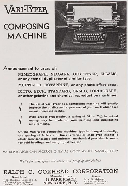 Werbeanzeige für Schreibmaschine VariTyper monochrom