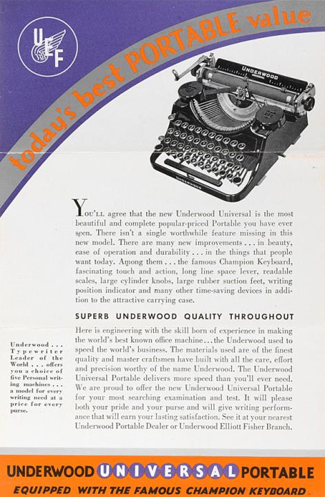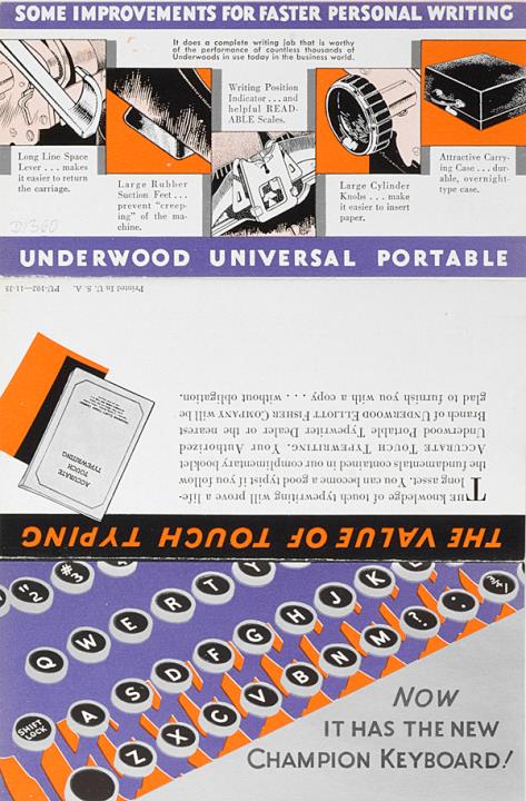 Faltprospekt für tragbare Schreibmaschine Underwood Now it has the new Champion Keyboard Nr. PU-102-11-35