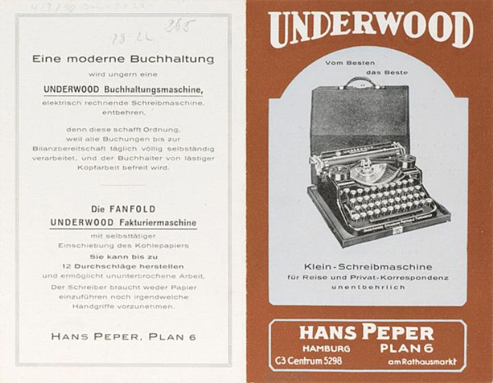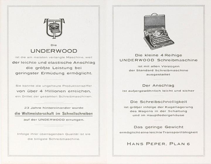 Faltprospekt für tragbare Schreibmaschine Underwood Für Reise und Privat-Korrespondenz unentbehrlich
