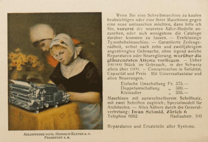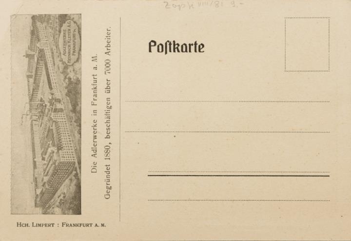 Werbepostkarte; Grafik, polychrom; Rückseite: Mädchen mit Schreibmaschine Adler, daneben Werbetext; Vorderseite: Ansicht der Adler Schreibmaschinenwerke; nicht beschrieben