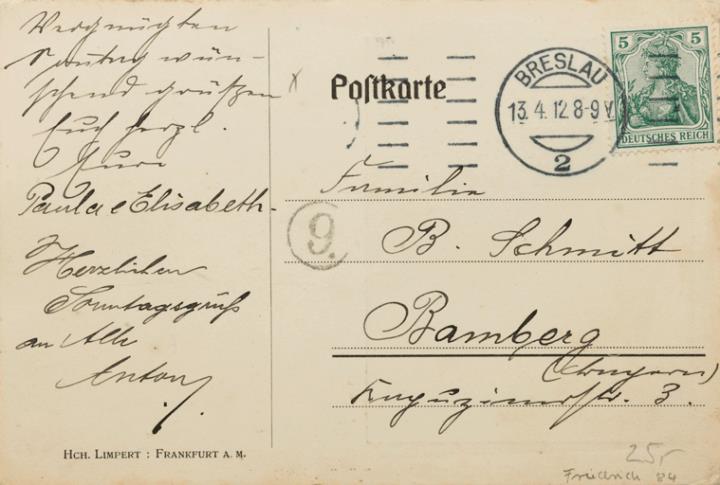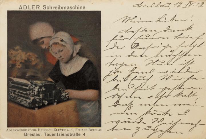 Werbepostkarte; Grafik, polychrom Rückseite: Mädchen mit Schreibmaschine Adler, Leerraum beschrieben, datiert 12 IV 12; Vorderseite: beschrieben; adressiert an Fam. Schmidt, Bamberg; Briefmarke Deutsches Reich 5 Pf.; Poststempel 13.4.1912