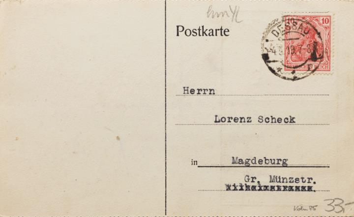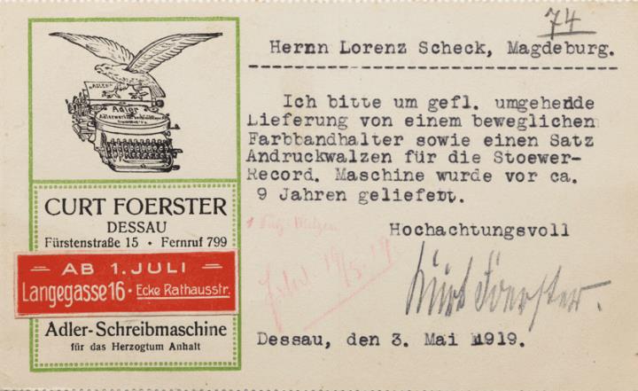 Postkarte mit Werbebild; Grafik, polychrom Rückseite: Schreibmaschine Adler, maschinenschriftlicher Text Vorderseite: adressiert an Herrn Schenk, Magdeburg; Briefmarke Deutsches Reich 10 Pf.; Poststempel Dessau/4.5.1919