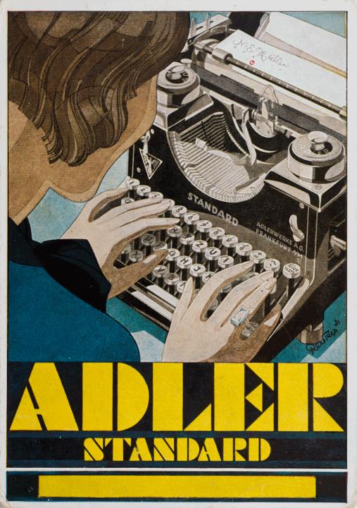 Werbepostkarte; Grafik, polychrom Rückseite: Frau mit Schreibmaschine Adler Standard Vorderseite beschrieben