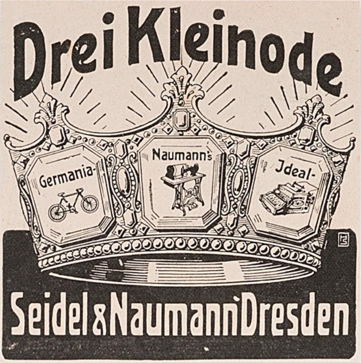 Drei Kleinode Germania-Fahrrad Naumann's Nähmaschine Ideal-Schreibmaschine