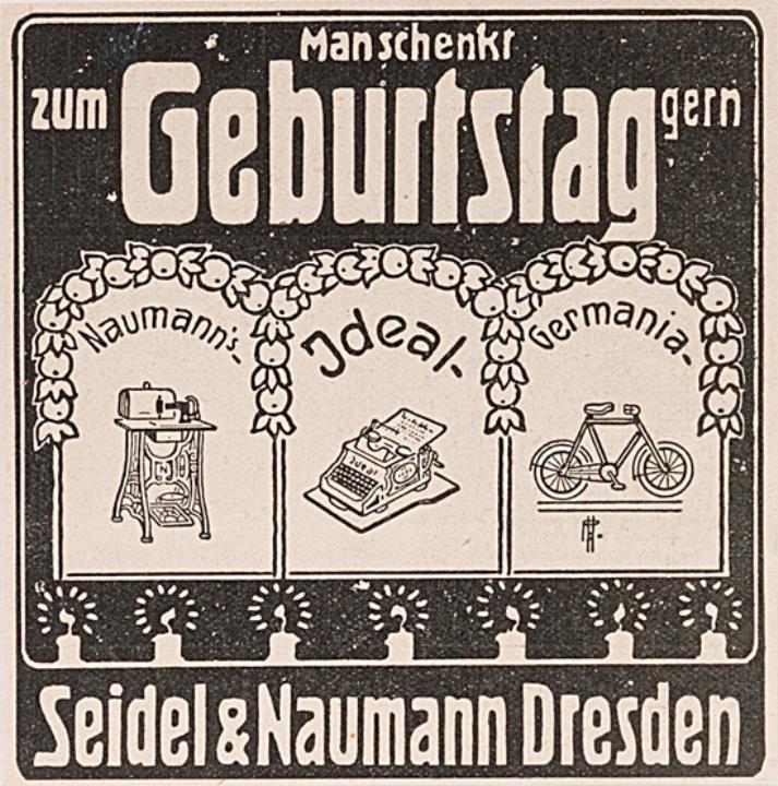 Werbeanzeige des Schreibmaschinenherstellers Seidel & Naumann monochrom