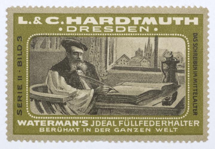 Reklamemarke/Werbemarke einer Serie für Bürowarenhandlung Hardtmuth; rechteckig, polychrom Serie II, Bild 3. Das Schreiben im Mittelalter weiterer Text: Waterman's Ideal Füllfederhalter. Berühmt in der ganzen Welt