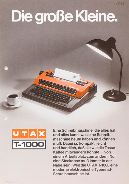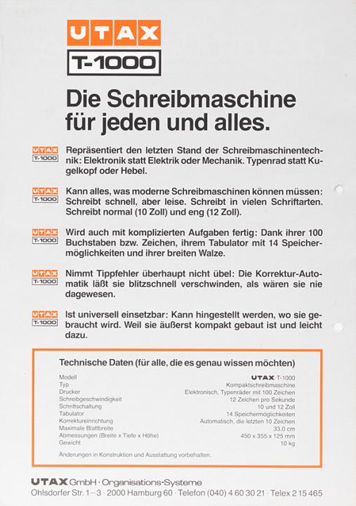 Prospekt für elektronische Schreibmaschine Utax T-1000 Datum handschriftlich vermerkt