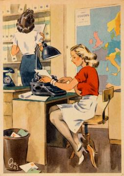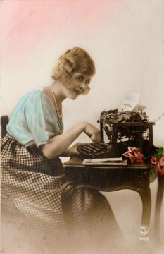Illustrierte Postkarte; Fotografie, koloriert; Serie PC Paris 606 Rückseite: Frau mit Schreibmaschine, Blick zum Betrachter Vorderseite nicht beschrieben