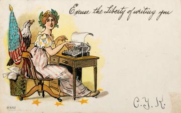 Illustrierte Postkarte; Grafik, polychrom; Nr. H652 Rückseite: Frau als Freiheitsstatue mit Schreibmaschine, daneben amerikanische Flagge und Wappenvogel; beschrieben Vorderseite: adressiert an Miss Steindley, New York City; Briefmarke U.S. Postage One Cent; Poststempel unleserlich