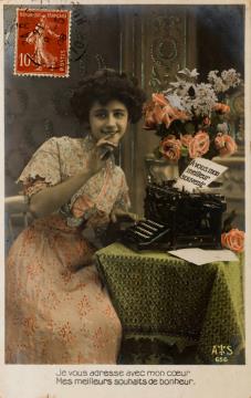 Illustrierte Postkarte; Fotografie, koloriert; Serie AS 656 Rückseite: junge Frau mit Schreibmaschine, Blick zum Betrachter, Blumen als Dekoration, darunter Text in Versform; Briefmarke Postes Francaises 10c; Poststempel Paris/21 8-5 1908 Vorderseite: adressiert an Madame Popineau, Cher