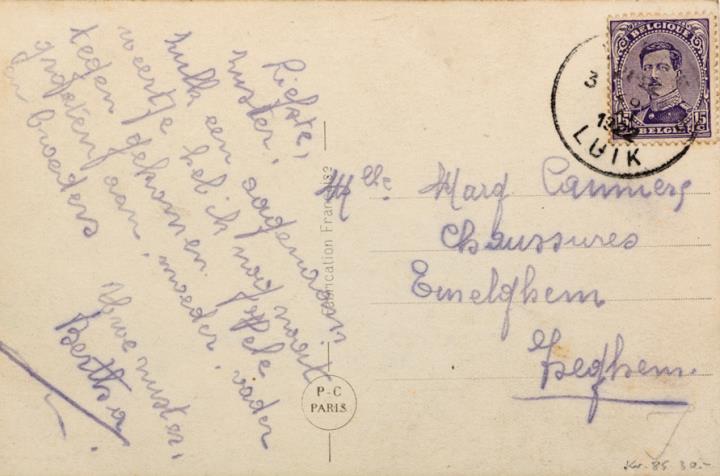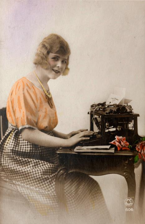 Illustrierte Postkarte; Fotografie, koloriert; Serie PC Paris 606 Rückseite: Frau mit Schreibmaschine, Blick zum Betrachter Vorderseite: beschrieben; adressiert an M.lle Canniers, Izeghem; Briefmarke Postes Belgique 15c; Poststempel Luik/1922