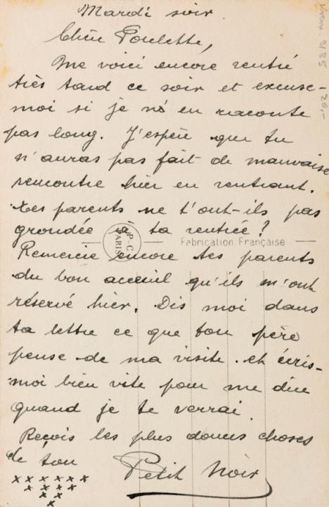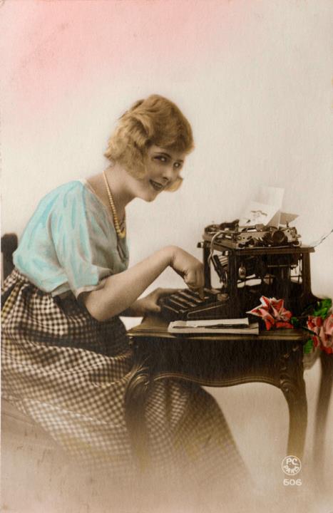 Illustrierte Postkarte; Fotografie, koloriert; Serie PC Paris 606 Rückseite: Frau mit Schreibmaschine, Blick zum Betrachter Vorderseite beschrieben