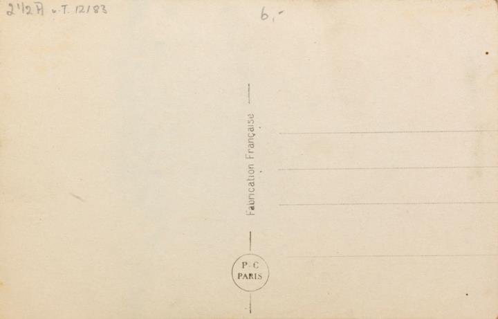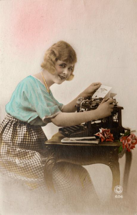 Illustrierte Postkarte; Fotografie, koloriert; Serie PC Paris 606 Rückseite: Frau mit Schreibmaschine, Blick zum Betrachter Vorderseite nicht beschrieben