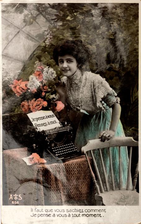 Illustrierte Postkarte; Fotografie, koloriert; Serie AS 656 Rückseite: junge Frau mit Schreibmaschine, Blick zum Betrachter, Blumen als Dekoration, darunter Text in Versform Vorderseite: adressiert an Monsieur Lineé, Dison; Briefmarke Postes Belgique 1c; Poststempel Dison/1 Octo 26.21 19xx