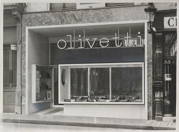 Fotografie, monochrom; Details mit weißem Stift akzentuiert Foto: Photoindus Bruxelles Ansicht Geschäftsgebäude Olivetti in Brüssel, Vitrinen mit Schreibmaschinen Olivetti Rückseite: handschriftlicher Beschreibungstext, Fotostudio-Stempel