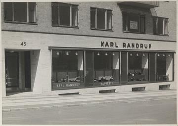 Fotografie, monochrom; Details mit weißem Stift akzentuiert Foto: Jonals Co Kobenhavn Ansicht Geschäftsgebäude der Schreibmaschinenhandlung Karl Randrup, Vitrinen mit Schreibmaschinen Olivetti Rückseite mit Fotostudio-Stempel