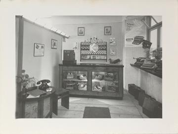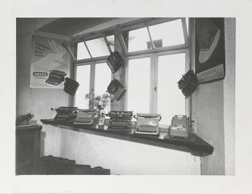 Fotografie, monochrom Verkaufsraum einer Schreibmaschinenhandlung mit Werbeplakaten, Schreibmaschinen, Reinigungsutensilien, Telefon und Registrierkasse