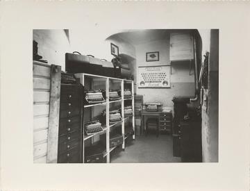 Fotografie, monochrom Ausstellungssraum (Untergeschoss) einer Schreibmaschinenhandlung mit Schreibmaschinen und Tastaturschautafel Everest