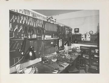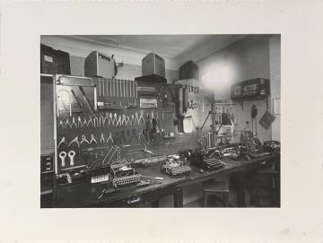 Fotografie, monochrom Ansicht Reparaturwerkstatt; Werkzeugwand und Werktisch mit Schreibmaschinen