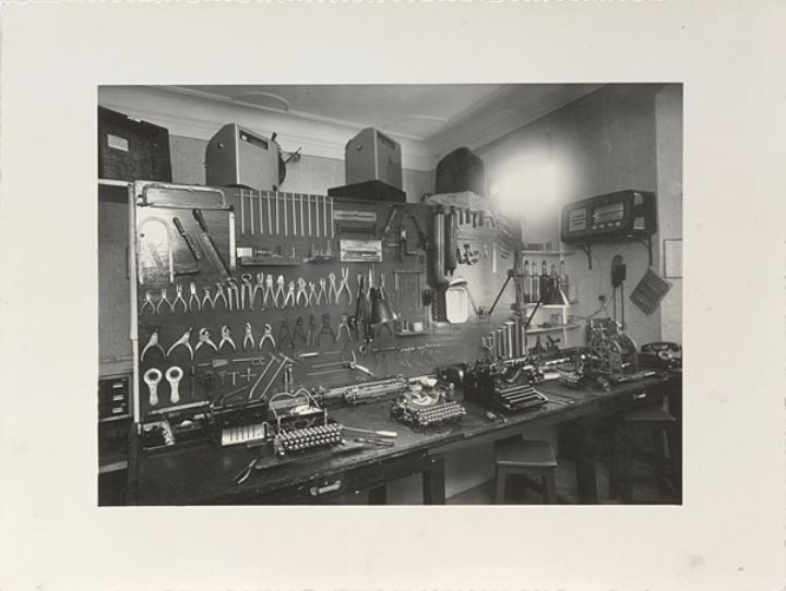 Fotografie, monochrom Ansicht Reparaturwerkstatt; Werkzeugwand und Werktisch mit Schreibmaschinen und Registrierkasse