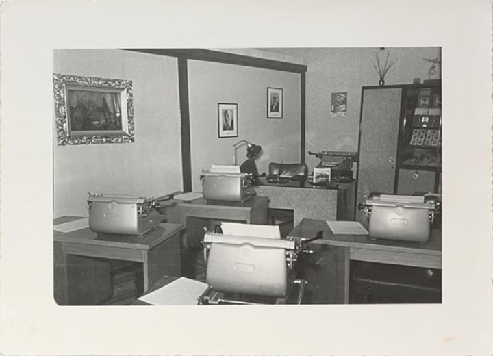Fotografie, monochrom Ansicht Büro mit Schreibmaschinen Everest, im Hintergrund Vitrine mit Farbbanddosen