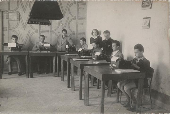 Schule, Maschinenschreiben, mechanisches Schreiben, Schreibmaschine, Mann, Frau, Kind, Kleidung, Mode, Propaganda, Geschichte