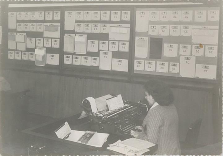 Fotografie, monochrom Büroansicht; Frau mit Buchungsschreibmaschine