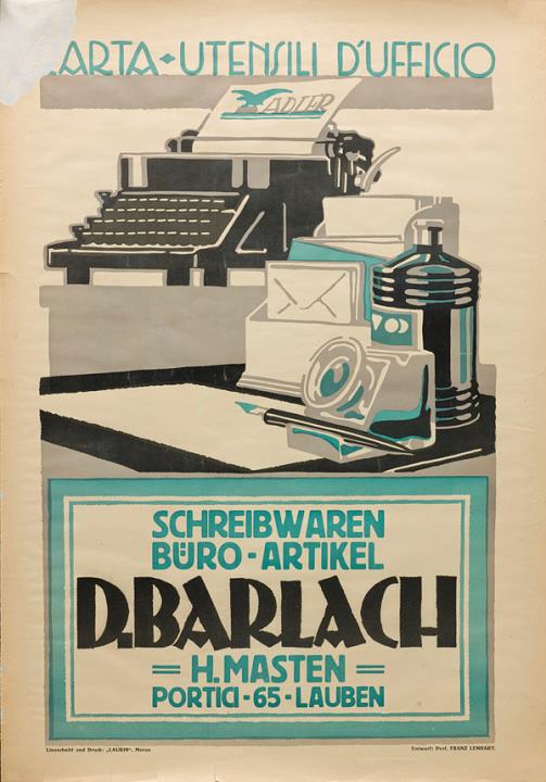 Werbeplakat für Schreib- und Bürowarenhandlung D. Barlach, Meran auf Leinengewebe kaschiert
