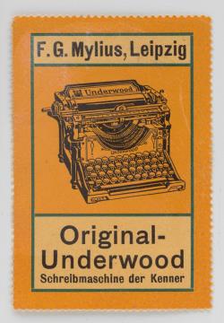 Reklamemarke/Werbemarke für Schreibmaschine Underwood rechteckig, polychrom Text: F.G. Mylius, Leipzig
