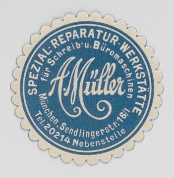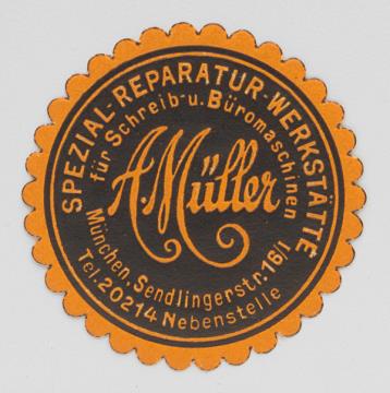 Siegelmarke für Schreibmaschinen-Reparaturwerkstatt A. Müller; rund, monochrom Text: München, Sendlingerstr. 16/I [...]