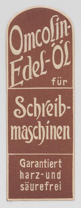 Siegelmarke für Schreibmaschinenöl Omcolin rechteckig mit Rundbogen, monochrom